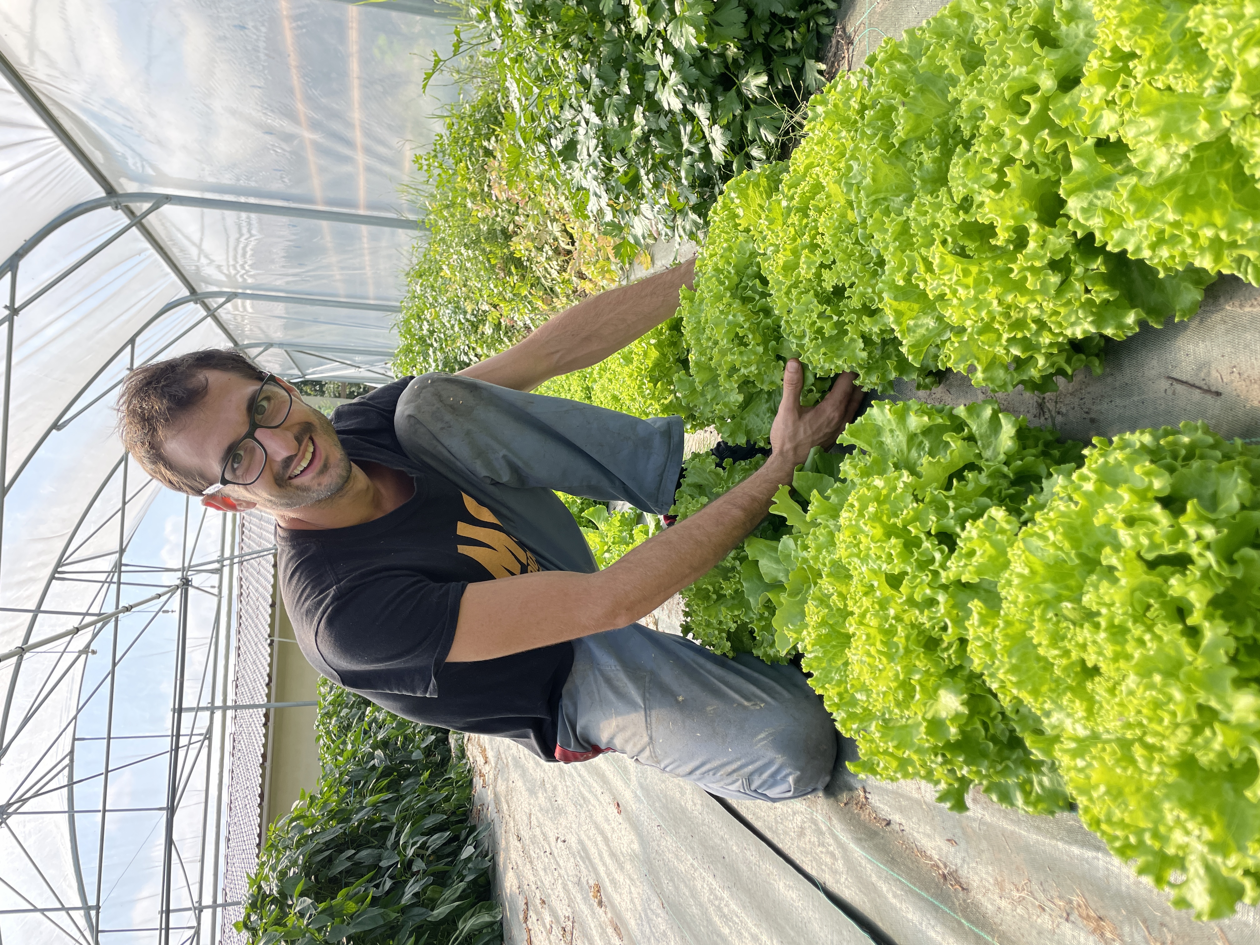 Maraîcher de cœur et d’âme, il travaille au quotidien sur la production des légumes. Il a à cœur de produire des légumes de qualité, des qualités nutritionnelles, mais aussi des légumes avec du goût. Il a choisi de produire l’ensemble des légumes en MSV « maraîchage sur sol vivant », dans un respect permanent de la vie du sol et sans aucun engrais chimique. Passionné et autodidacte, il travaille en harmonie avec la nature.